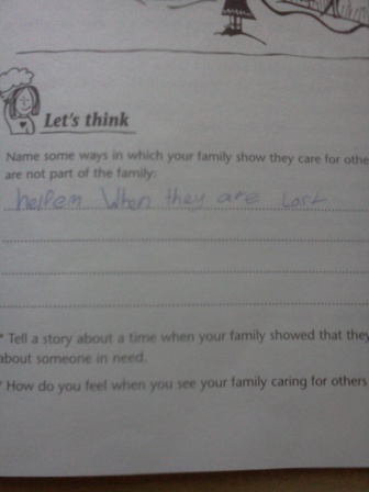 We’ve skipped our way past walls of mind numbing text about the sacrament of confirmation and how community works and some hot shot named Luke. But that isn’t what we’re here for. What we are here for is to see past me’s abilities to handle these activities. I am sure I was a bright child back then. From here we can see that my handwriting was a lot better over a decade ago. Look at the disjointed ‘h’, and the mess of capitals strewn throughout my answers. Obviously we’re dealing with some sort of child genius here. I should give past me a pat on the back for being such an English whiz-ard.